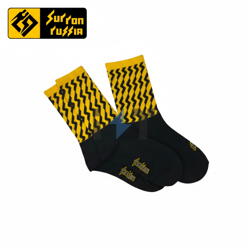 Носки с фирменной символикой SUR-RON. Черно-желтый дизайн.